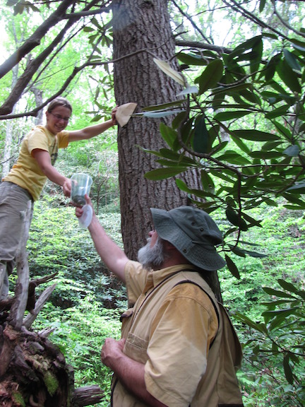 More recently, the Carolina Mountain Land Conservancy (CMLC) has encouraged and assisted its conservation easement property owners in initiating HWA biocontrol efforts in hemlock areas throughout CMLC’s multi-county area in western North Carolina. But it has placed special emphasis on protecting Carolina Hemlock colonies on Land Trust conservation lands in the Hickory Nut Gorge area. Below are CMLC Stewardship Director Julia Brockman and CMLC volunteer Patrick Horan releasing St beetles on a large (31″ DBH) Carolina Hemlock on CMLC’s Weed Patch property in the NC Hickory Nut Gorge. Often the hardest part of a release on a large tree like this is fastening the coffee filter to the trunk! But how polite would it be to wish your little predators “Bon appetit” and then dump them on the ground? (For more information on CMLC’s hemlock restoration efforts, involving both Carolina hemlocks (Tsuga caroliniana) and eastern hemlocks (Tsuga canadensis), go to Community page.)